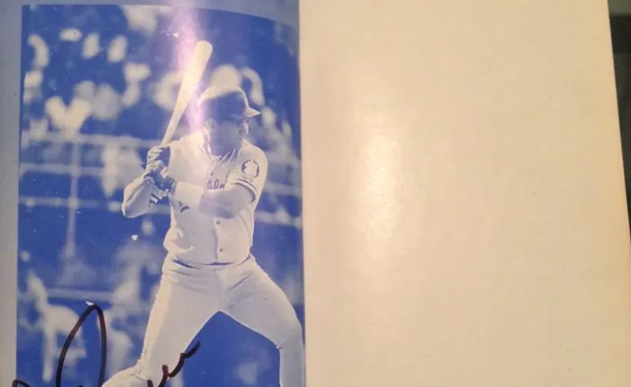 La firma de la imagen la hizo Luis, antes de un juego versus los Tiburones, en el dogout de tercera base del estadio Universitario, desde ver la misma vienen flashes a mi mente como los de la dificultad de Raven, para batear los envíos lentos y afuera, lo cual aprovecharon las Águilas del Zulia, en Maracaibo, en el round robin de la 93-94, pero también su actuación en la final de esa campaña, en especial su jonrón por el jardín central en el segundo juego de la misma que hubiese significado el empate a cuatro en la baja del noveno de no haber sido el Almirante decretado out en jugada cerrada en el turno antes, tras un machucón por tercera, que le costó la expulsión, tras el reclamo y el lanzamiento de una botella desde las tribunas al árbitro Fidel García.